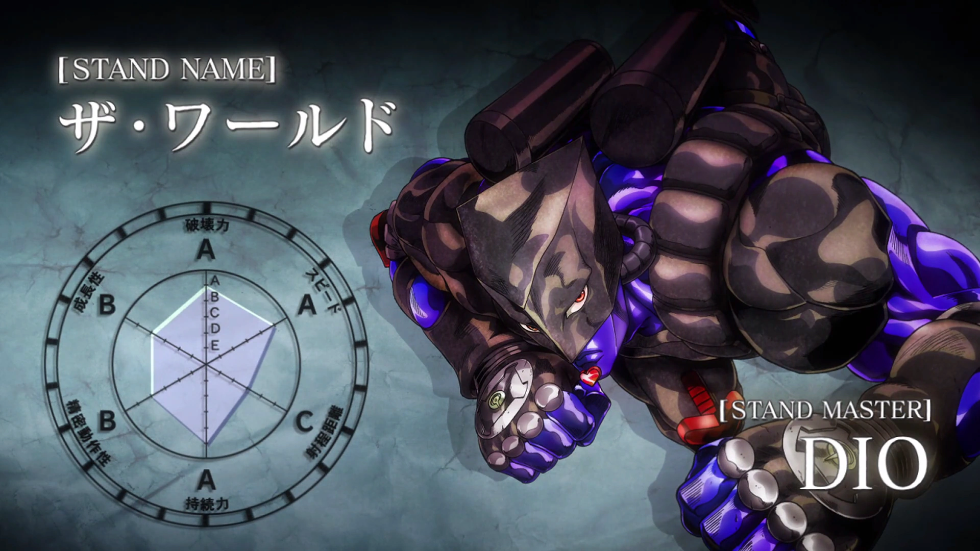 The world es el stand del villano de la tercera parte de Jojo's Bizarre Adventure, también es el antagonista de Star Platinum los cuales son del mismo tipo de stand. Este stand es increiblemente poderoso debido a sus habilidades que comentaremos más adelante. Su primera aparición es en el capítulo ocho de Stadust Crusaders y su última aparición en el capítulo cuarenta y ocho, donde se le consigue derrotar y, por consecuente, matar (Anime).